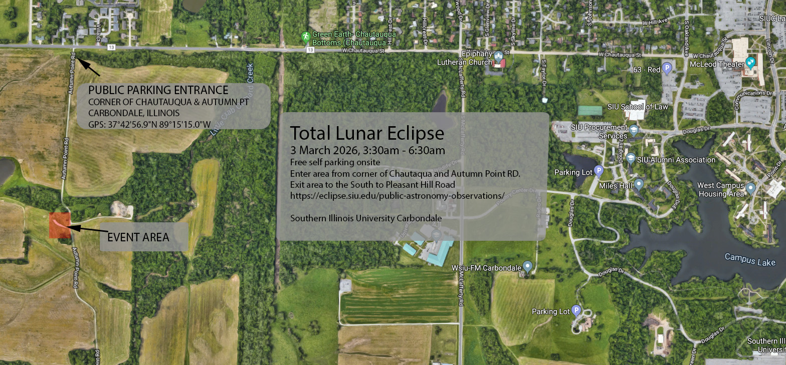 Free public astronomy observation of a total lunar eclipse at the SIU Carbondale Farms Astronomy Observation Area, located approximately 2 miles west of the main SIU campus off Chautauqua road. The site will be open to the public 3:30am – 6:30am on the morning of Tuesday, March 3, 2026. Earlier entry encouraged for individuals wanting to setup telescopes or photography equipment. A limited number of concrete telescope pads are available on a first come first served basis. Free onsite parking. From this location, the first phases of the eclipse through totality are visible with the moon setting in the final partial phase.